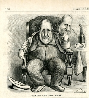 Taking off the mask : Tweed sitzt erschöpft in einem Sessel und nimmt eine Maske ab, die sein lächelndes Gesicht zeigt / [Frank Bellew]