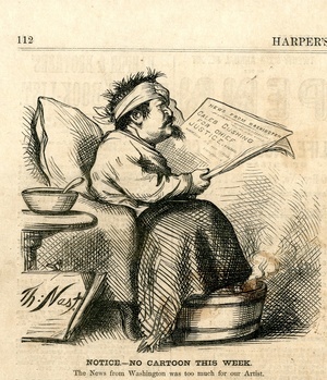 Notice. - No cartoon this week. The News from Washington was too much for our Artist : Thomas Nast sitzt krank in einem Sessel und liest Zeitung / Th. Nast
