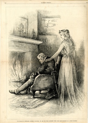 "No change is necessary, General Hancock; we are too well satisfied with your brave record as a Union soldier." : Columbia tröstet General Hancock, der niedergeschlagen in einem Sessel sitzt / Th. Nast