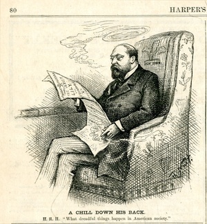 A chill down his back. H.R.H. "What dreadfull things happen in American society." : ein Mann, der in einem Sessel sitzt, liest eine Zeitung / Th. Nast