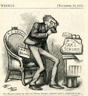 The Missouri papers say that (ex) Gratz Brown's objective point is understood to be : Carl Schurz erhebt sich nachdenklich aus seinem Sessel im Senat / Th. Nast