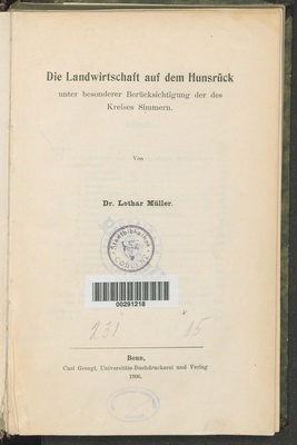 Die Landwirtschaft auf dem Hunsrück : unter besonderer Berücksichtigung der des Kreises Simmern / von Lothar Müller