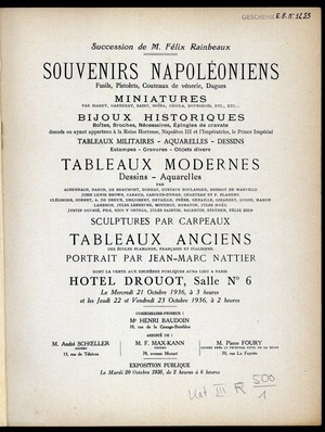 Souvenirs napoléoniens ..., miniatures ..., bijoux historiques ..., tableaux militaires, aquarelles, dessins, estampes, gravures, objets divers, tableaux modernes, dessins, aquarelles ..., sculptures par Carpeaux ... : succession de M. Félix Rainbeaux ; dont la vente ... aura lieu à Paris, Hotel Drouot, le 21, 22 et 23 octobre 1936 / commissaire-priseur Henri Baudoin ...