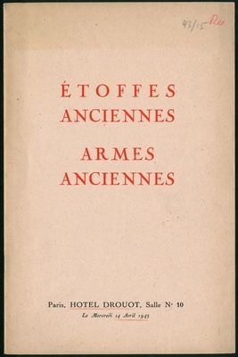 Catalogue des étoffes anciennes : velours persans du XVe siècle : armes anciennes : armes blanches, armes à feu et de jet, armes d'exécution, instruments de justice et de de torture : souvenirs napoléoniens : appartenant à divers amateurs : dont la vente aux enchères publiques aura lieu Hôtel Drouot, Salle No 10 le mercredi 14 avril 1943 / commissaire-priseur: Étienne Ader, successeur de Maurice Ader et F. Lair Dubreuil ; assisté pour les souvenirs de: L. Bourdier, expert, pour les étoffes de: J. Subert, expert près les douanes françaises, pour les armes anciennes de: Charles, expert près les douanes françaises