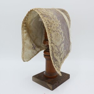 Hellviolette Trachtenhaube mit Stickerei und Grau-Beige Farbenen Bändern