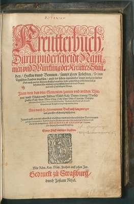Kreütterbůch/|| Darin vnderscheidt/ Nam=||men/ vnd Würckung der Kreütter/ Stau=||den/ Hecken vnnd Beumen/ sampt jhren Fr#[ue]chten/ so inn || Teutschen Landen wachsen ... || fleissig dargeben ... || Jtem von den vier Elementen/ zamen vnd wilden Thie=||ren ... || Alles durch H.Hieronymum Bock ... || beschriben.|| Jetzund auffs new mit allem fleiß vbersehen ... || Durch ... MELCHIOREM SEBIZIVM Silesium,|| Der Artzney Doctorn zů Straßburg.|| Sampt ... Registern.||