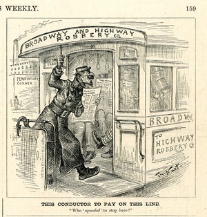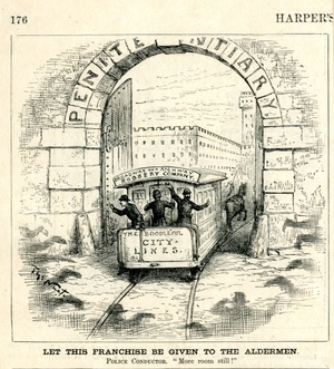 Let this franchise be given to the aldermen. Police conductor. "More room still!" : Häftlinge werden mit einer Straßenbahn in das Gefängnis gebracht / Th. Nast