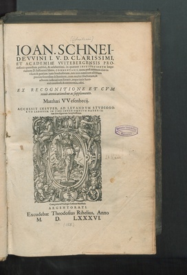 IOAN. SCHNEI-||DEVVINI I. V. D. CLARISSIMI,|| ET ACADEMIAE VVITEBERGENSIS PRO-||fessoris quondam publici, & celeberrimi, in quatuor INSTITVTIONVM Impe-||rialium D. Iustiniani libros, COMMENTARII, nunc post mortem eius in || vsum & gratiam iuris Studiosorum, nec non omnium aliorum || praxim forensem sectantium, cum multis libellorum, & || actuum iudicialium formis, atque iuris Saxo-||nici consensu & antinomia, editi.|| EX RECOGNITIONE ET CVM || nouis annotationibus ac supplemento.|| Matthaei VVesenbecij.|| ACCESSIT INSVPER ... || IN FINE INDEX ... ||