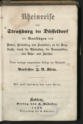 Rheinreise von Straßburg bis Düsseldorf : mit Ausflügen nach Baden, Heidelberg und Frankfurt, an die Bergstraße, durch die Rheinpfalz, die Taunusbäder, das Nahe- und Ahrthal