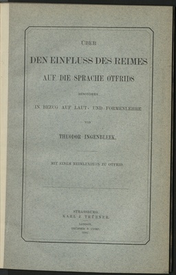 Über den Einfluss des Reimes auf die Sprache Otfrids : besonders in Bezug auf Laut- und Formenlehre ; mit einem Reimlexikon zu Otfrid / Theodor Ingenbleek