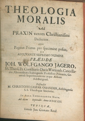 Theologia Moralis Ad Praxin veram Christianismi Deducens cujus Paginas Primas pro specimine posuit, Et Adjuvante Supremo Numine / Praeside Joh. Wolfgango Jägero, SS. Theol. D. Consiliario Ducis Würtemb. Cancellario ... Defendet M. Christoph Caspar Osiander, Aithlingensis S. S. Theologiae Studiosus ... Ad diem [...] Septembr. Anno MDCCXIII.