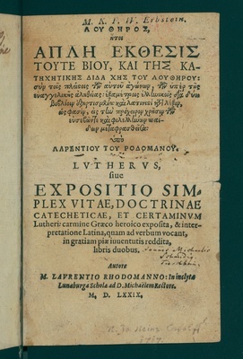 LUTHĒROS, ētoi HAPLĒ EKTHESIS TUTE BIU, KAI TĒS KA-TĒCHĒTIKĒS DIDACHĒS TU LUTHĒRU : Carmine graeco heroico exposita... / auctore Laurentio Rhodomanno