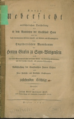 Kurze Uebersicht der ausführlichen Darstellung der in dem Mannlehen der Grafschaft Sayn und den dieser incorporirten Erblehen sowohl, als Allodial- und Stammgütern dem Engelbertischen Mannstamme der Herren Grafen zu Sayn-Wittgenstein nach dem alten Gewohnheitsrechte des hohen Adels, den besonderen Erbvereinen, und den deutschen sowohl, als gemeinen Lehenrechten, mit Ausschließung der Ernestinischen Frauen Töchter und Ihrer Fürstlich- und Gräflichen Nachkommen allein zustehenden Erbfolge / verfasset von Joseph Aloys Ferdinand Haas