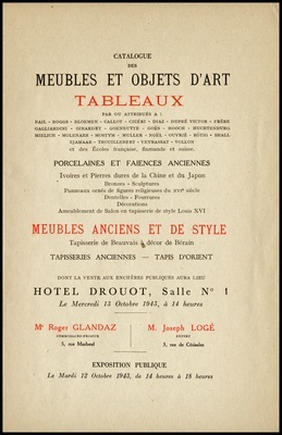 Catalogue des meubles et objets d'art : tableaux : par ou attribués à: Bail, Boggs, Bloemen, Callot, Cicéri, Diaz, Dupré Victor [und weitere] et des Écoles française, flamande et suisse : porcelaines et faïences anciennes : ivoires et pierres dures de la Chine et du Japon : bronzes, sculptures, panneaux ornés de figures religieuses du XVIe siècle, dentelles, fourrures, décorations, ameublement de salon en tapisserie et style Louis XVI : meubles anciens et de style : tapisserie de Beauvais à décor de Bérain : tapisseries anciennes, tapis d'Orient : dont la vente aux enchères publiques aura lieu Hôtel Drouot, Salle No 1, le mercredi 13 octobre 1943 / Roger Glandaz, commissaire-priseur ; Joseph Logé, expert