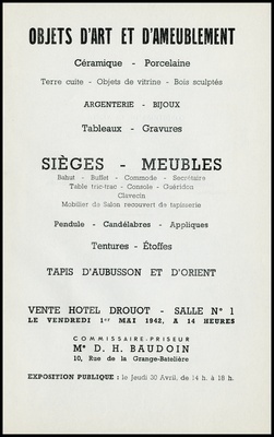 Objets d'art et d'ameublement : céramique, porcelaine : terre cuite, objets de vitrine, bois sculptés : argenterie, bijoux : tableaux, gravures : sièges - meubles : bahut, buffet, commode, secrétaire, table tric-trac, console, guéridon, clavecin, mobilier de Salon recouvert de tapisserie : pendule, candélabres, appliques : tentures, étoffes : tapis d'Aubusson et d'Orient : vente Hôtel Drouot, Salle No 1 le vendredi 1 mai 1942 / commissaire-priseur: D.H. Baudoin