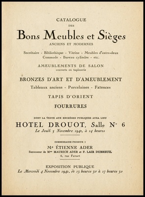 Catalogue des bons meubles et sièges : anciens et modernes : secrétaire, bibliothèque, vitrine, meubles d'entre-deux, commode, bureau cylindre - etc. : ameublement de salon : couverts en tapisserie : bronzes d'art et d'ameublement : tableaux anciens, porcelaines, faïences : tapis d'Orient : fourrures : dont la vente aux enchères publiques aura lieu Hôtel Drouot, Salle No 6 le jeudi 5 novembre 1942 / commissaire-priseur: Étienne Ader, successeur de Maurice Ader et F. Lair Dubreuil