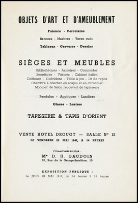 Objets d'art et d'ameublement : faïence, porcelaine : bronzes, marbres, terre cuite : tableaux, gravures, dessins : sièges & meubles : bibliothèques, armoires, commodes, secrétaire, vitrines, cabinet italien, coiffeuse, guéridons, table à jeu, lit de repos, chambre à coucher en acajou et en citronnier, mobilier de Salon recouvert de tapisserie : pendules, appliques, landiers : glaces, lustres : tapisserie & tapis d'Orient : vente Hôtel Drouot, Salle No 12 le vendredi 29 mai 1942 / commissaire-priseur: D.H. Baudoin