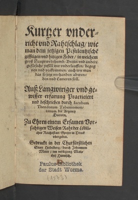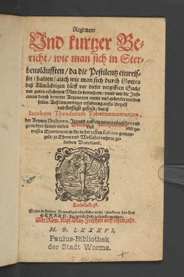 Regiment und kurtzer Bericht, wie man sich in Sterbensläufften, da die Pestilentz einreisset, auch wie man sich durch Gottes ... Hülff ... mit guten Mitteln bewahren, u. wie die Inficirten durch bewerte Artzneyen curirt u. geheylet werden sollen ... durch Iacobum Theodorum Tabernaemontanum