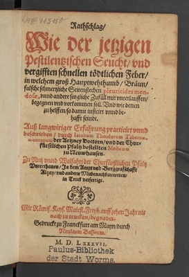 Rathschlag, wie der jetzigen pestilentzischen Seucht, und vergifften schnellen tödtlichen Feber, in welchem groß Hauptwehthumb, Bräun, falsche schmertzliche Seitenstechen, pleuritides mendosae, u. andere sorgliche Zufäll mit unterlauffen, begegnen u. vorkommen soll ... / beschrieben durch Iacobum Theodorum Tabernaemontanum