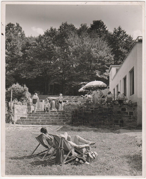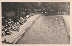Ansichtskarten Motiv „Schwimmbadbetrieb von Dachterrasse aus"