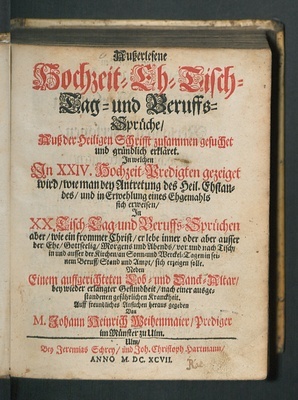 Außerlesene Hochzeit- Eh- Tisch- Tag- und Beruffs-Sprüche : Auß der Heiligen Schrifft zusammen gesuchet und gründlich erkläret. Jn welchen Jn XXIV. Hochzeit-Predigten gezeiget wird/ wie man bey Antretung des Heil. Ehstandes/ und in Erwehlung eines Ehgemahls sich erweisen/ Jn XX. Tisch- Tag- und Beruffs-Sprüchen aber/ wie ein frommer Christ/ ... sich erzeigen solle. Neben Einem auffgerichteten Lob- und Danck-Altar/ ... / Auff freundliches Ansuchen heraus gegeben Von M. Johann Heinrich Weihenmaier/ Prediger im Münster zu Ulm