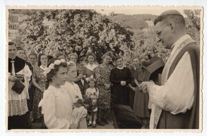 Zwei Kommunionkinder sprechen mit Priester