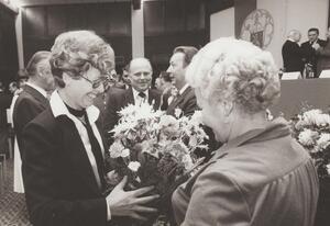 Frau Lasicki und Ellie Sprindt bei Verabschiedung Bürgermeister Karl Schön, Bendorf 1979