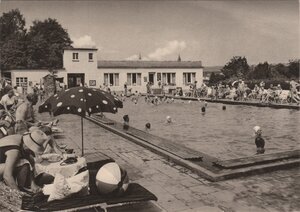 Druckvorlage für Ansichtskarte "Blick über das Schwimmbad zum Eingangsbereich und Schwimmbadcafé"