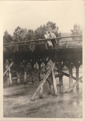Zei Junge Frauen stehen auf der 1940 gebauten Pionierbrücke über die Ahr