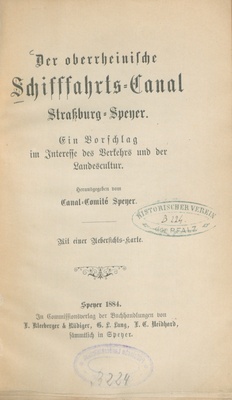 Der oberrheinische Schiffahrts-Canal Straßburg-Speyer : ein Vorschlag im Interesse des Verkehrs und der Landescultur / hrsg. vom Canal-Comité Speyer