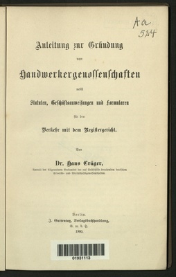 Anleitung zur Gründung von Handwerkergenossenschaften : nebst Statuten, Geschäftsanweisungen und Formularen für den Verkehr mit dem Registergericht / von Hans Crüger