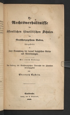 Die Rechtsverhältnisse der öffentlichen israelitischen Schulen im Großherzogthum Baden, dargestellt in einer Sammlung der darauf bezüglichen Gesetze und Verordnungen : mit einem Anhange / aus Auftrag des Großherzoglichen Oberraths der Israeliten herausgegeben von Oberrath Epstein