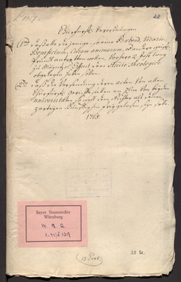 L 1317 - Kurfürstliche Verordnungen: 1.) daß alle, die eine Präbende, Vikarie, Benefizium oder andere geistliche Pfründen antreten wollen, 2 Jahre zu Mainz oder Erfurt dem Studium der Theologie obgelegen haben sollen; 2.) daß die Versendung der Akten an eine der beiden Universitäten sowohl dem Richter als den Parteien freistehen soll. 15 Prod.