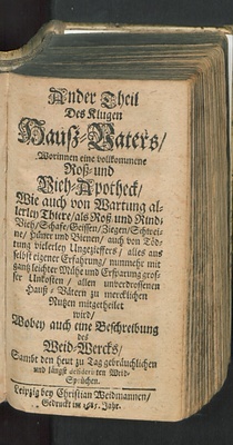 J. J. Bechers Kluger Haus-Vater und wohlerfahrner Land-Medicus - Ander Theil Des Klugen Hauß-Vaters/ Worinnen eine vollkommene Roß- und Vieh-Apotheck/ Wie auch von Wartung allerley Thiere/ als Roß und Rind-Vieh/ Schafe/ Geissen/ Ziegen/ Schweine/ Hüner und Bienen/ auch von Tödtung vielerley Ungezieffers/ alles aus selbst eigener Erfahrung/ nunmehr mit gantz leichter Mühe und Ersparung grosser Unkosten/ allen unverdrossenen Hauß-Vätern zu mercklichen Nutzen mitgetheilet wird/ Wobey auch eine Beschreibung des Weid-Wercks/ Sambt den heut zu Tag gebräuchlichen und längst desiderirten Weid-Sprüchen