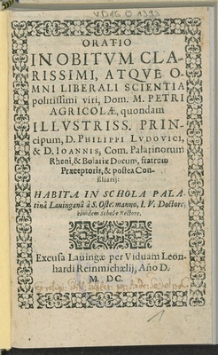ORATIO || IN OBITVM CLA-||RISSIMI, ATQVE O-||MNI LIBERALI SCIENTIA || politissimi viri, Dom. M. PETRI || AGRICOLAE, quondam || ILLVSTRISS. PRIN-||cipum, D. PHILIPPI LVDOVICI,|| & D. IOANNIS, Com. Palatinorum || Rheni, & Boiariae Ducum, fratrum || Praeceptoris, & postea Con-||siliarij:|| HABITA IN SCHOLA PALA-||tinâ Lauinganâ à S.Ostermanno, I.V.Doctore,|| eiusdem scholae Rectore.||