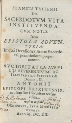 Joannis Tritemii De Sacerdotvm Vita Institvenda : Cvm Notis / Actoritate, & Avspicijs ... D. Antonii Episcopi Brixinensis... edita