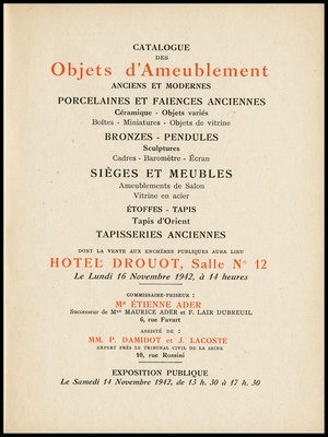 Catalogue des objets d'ameublement : anciens et modernes : porcelaines et faïences anciennes : céramique, objets variés : boîtes, miniatrues, objets de vitrine : bronzes, pendules : sculptures : cadres, baromètre, écran : sièges et meubles : ameublement de salon : vitrine en acier : étoffes, tapis : tapis d'Orient : tapisseries anciennes : dont la vente aux enchères publiques aura lieu Hôtel Drouot, Salle No 12 le lundi 16 novembre 1942 / commissaire-priseur: Étienne Ader, successeur de Maurice Ader et F. Lair Dubreuil ; assisté de: P. Damidot et J. Lacoste, expert près le Tribunal civil de la Seine