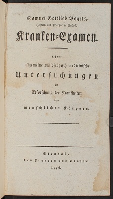 Samuel Gottlieb Vogels, Hofrath und Professor in Rostock, Kranken-Examen. Oder: allgemeine philosophisch medicinische Untersuchungen zur Erforschung der Krankheiten des menschlichen Körpers.