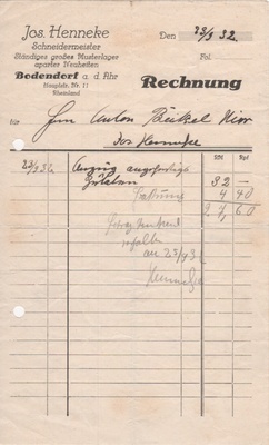 Rechnung von Schneidermeister Jos. Henneke für einen Anzug