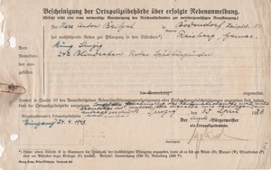 Bescheinigung der Ortspolizeibehörde über erfolgte Rebenanmeldung