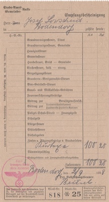 Empfangsbescheinigung über die Einzahlung der Kurtaxen an die Gemeinde Oktober 1938