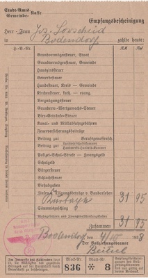 Empfangsbescheinigung über die Einzahlung der Kurtaxen an die Gemeinde September 1938