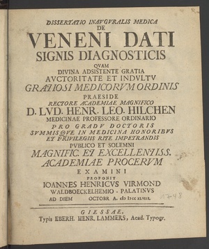 Dissertatio inavgvralis medica de veneni dati signis diagnosticis / qvam ... praeside ... Lvd. Henr. Leo. Hilchen ... pvblico et solemni ... examini proponit Ioannes Henricvs Virmond ...