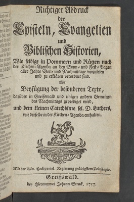 Richtiger Abdruck der Episteln, Evangelien und Biblischen Historien, Wie selbige in Pommern und Rügen nach der Kirchen-Agenda an den Sonn- und Fest-Tagen aller Jahre Vor- und Nachmittage vorzulesen und zu erklären verordnet sind.