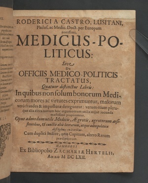 Roderici A Castro, Lusitani, Philos. ac Medic. Doct. per Europam notissimi, Medicus-Politicus: Sive De Officiis Medico-Politicis Tractatus : Quatuor distinctus Libris: In quibus non solum bonorum Medicorum mores ac virtutes exprimuntur, malorum vero fraudes & imposturae deteguntur ... Opus admodum utile Medicis, Aegrotis ... ; Cum duplici Indice, uno Capitum, altero Rerum praecipuarum