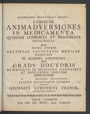 Dissertatio inavgvralis medica exhibens animadversiones in medicamenta qvaedam composita et praeparata officinalia / qvam ... pro gradv doctoris ... D. Decembr. MDCCLXXVIII. Pvblico ervditorvm examini svbiiciet Georgivs Lvdovicvs Franck, Argentoratensis.