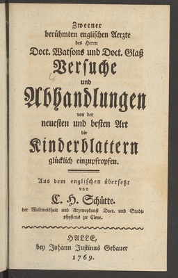 Zweener berühmten englischen Aerzte des Herrn Doct. Watsons und Doct. Glaß Versuche und Abhandlungen von der neuesten und besten Art die Kinderblattern glücklich einzupfropfen / Aus dem englischen übersetzt von C. H. Schütte. der Weltweisheit und Arzeneykunst Doct. und Stadtphysicus zu Cleve.