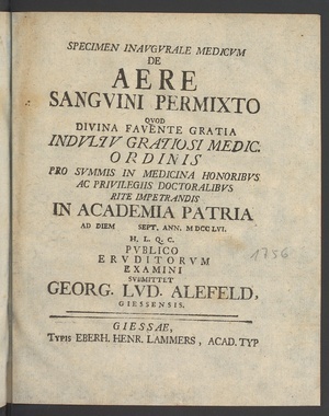 Specimen inavgvrale medicvm de aere sangvini permixto / qvod ... ad diem [] Sept. Ann. MDCCLVI. ... svbmittet Georg. Lvd. Alefeld, Giessensis.