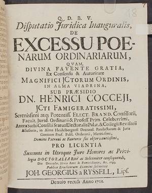 Disputatio Juridica Inauguralis, De Excessu Poenarum Ordinariarum / Qvam ... In Alma Viadrina, Sub Præsidio Dn. Henrici Cocceji ... Pro Licentia Summos in Utroque Jure Honores ac Privilegia Doctoralia Rite ac Solenniter consequendi, Die [ ] Decembr. ... An. 1693. Publico Eruditorum Examini submittit Joh. Georgius a Ryssel, Lips.