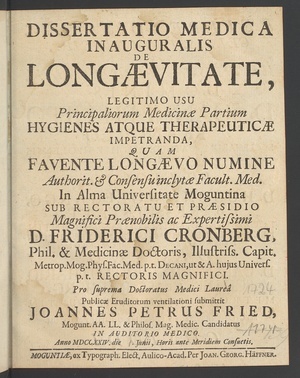Dissertatio Medica Inauguralis De Longævitate, Legitimo Usu Principaliorum Medicinæ Partium Hygienes Atque Therapeuticæ Impetranda / Quam ... In Alma Universitate Moguntina Sub Rectoratu Et Præsidio Magnifici Praenobilis ac Expertissimi Friderici Cronberg ... Pro suprema Doctoratus Medici Laurea Publicæ Eruditorum ventilationi submittit Joannes Petrus Fried, Mogunt. A A. L L. & Philos. Mag. Medic. Candidatus In Auditorio Medico, Anno MDCCXXIV. die [ ] Junii, Horis ante Meridiem Consuetis.